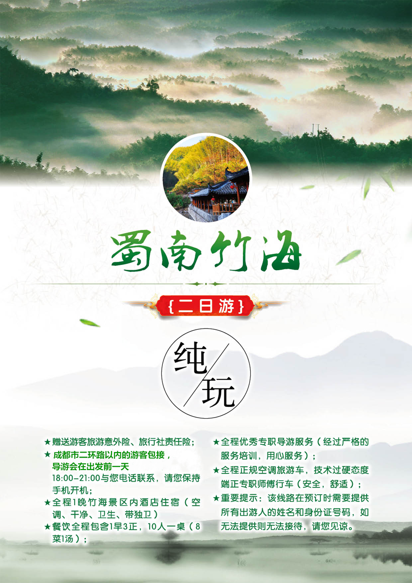 蜀南竹海早上乘车由成都出发,途经甜城内江,灯之城,龙之乡,盐之都--自贡抵达万里长江第一城--宜宾。午餐后乘车前往国家级风景名胜区“蜀南竹海”,沿途欣赏“不是漓江,胜似漓江”的育江风光,游览忘忧谷(游览时间不低于1小时)感受千年茂林曲径悠的意境,并乘坐观光上行索道览竹海全景,体验在竹尖上行走的感觉,感受万顷波涛竹海涌得气势【索道费用自愿自理往返40元/人,单程30元/人】,上竹海半山登观海楼,留影“色如渥丹,灿若明霞”的翡翠长廊(游览时间不低于20分钟),前往照影潭(游览时间不低于1小时)划竹筏,泛舟湖中寻找《卧虎藏龙》之地,倾听琴蛙如歌的鸣叫【竹筏费用自愿自理40元/人】,晚餐后入住酒店。早上乘车由成都出发,途经甜城内江,灯之城,龙之乡,盐之都--自贡抵达万里长江第一城--宜宾。午餐后乘车前往国家级风景名胜区“蜀南竹海”,沿途欣赏“不是漓江,胜似漓江”的育江风光,游览忘忧谷(游览时间不低于1小时)感受千年茂林曲径悠的意境,并乘坐观光上行索道览竹海全景,体验在竹尖上行走的感觉,感受万顷波涛竹海涌得气势【索道费用自愿自理往返40元/人,单程30元/人】,上竹海半山登观海楼,留影“色如渥丹,灿若明霞”的翡翠长廊(游览时间不低于20分钟),前往照影潭(游览时间不低于1小时)划竹筏,泛舟湖中寻找《卧虎藏龙》之地,倾听琴蛙如歌的鸣叫【竹筏费用自愿自理40元/人】,晚餐后入住酒店。